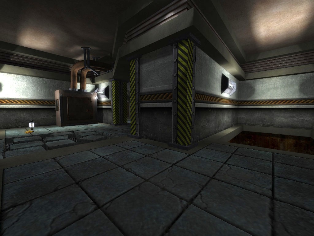 Комментарий: Велико было желание растянуть карту в полтора раза, но я себя сдержал. Как мне кажется, коэффициент 1.25 удовлетворит и игроков, и меня. Карта выглядит фактически так же, но ударов головой об притолоки уже нет. Кроме того бассейн с лавой стал глубже - были претензии к тому, что игрок чувствует себя обдолбанным Иисусом, гуляя по огненному полю. Теперь там можно утонуть, аминь. Во имя динамики его величество Reilgun Nex был заменен скорострельной ракетницей Hagar, так что плата за удачный прыжок над лавой (а бассейн ведь стал не только глубже, но и шире) поднялась.